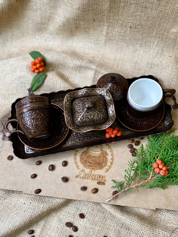 подарунковий турецький набір для кави, турецький сервіз для кави, набір турецьких чашок для кави, купити турецький сервіз, турецький подарунковий набір, чашки з кришечками, турецький посуд на подарунок, латунний турецький сервіз, піднос з чашками